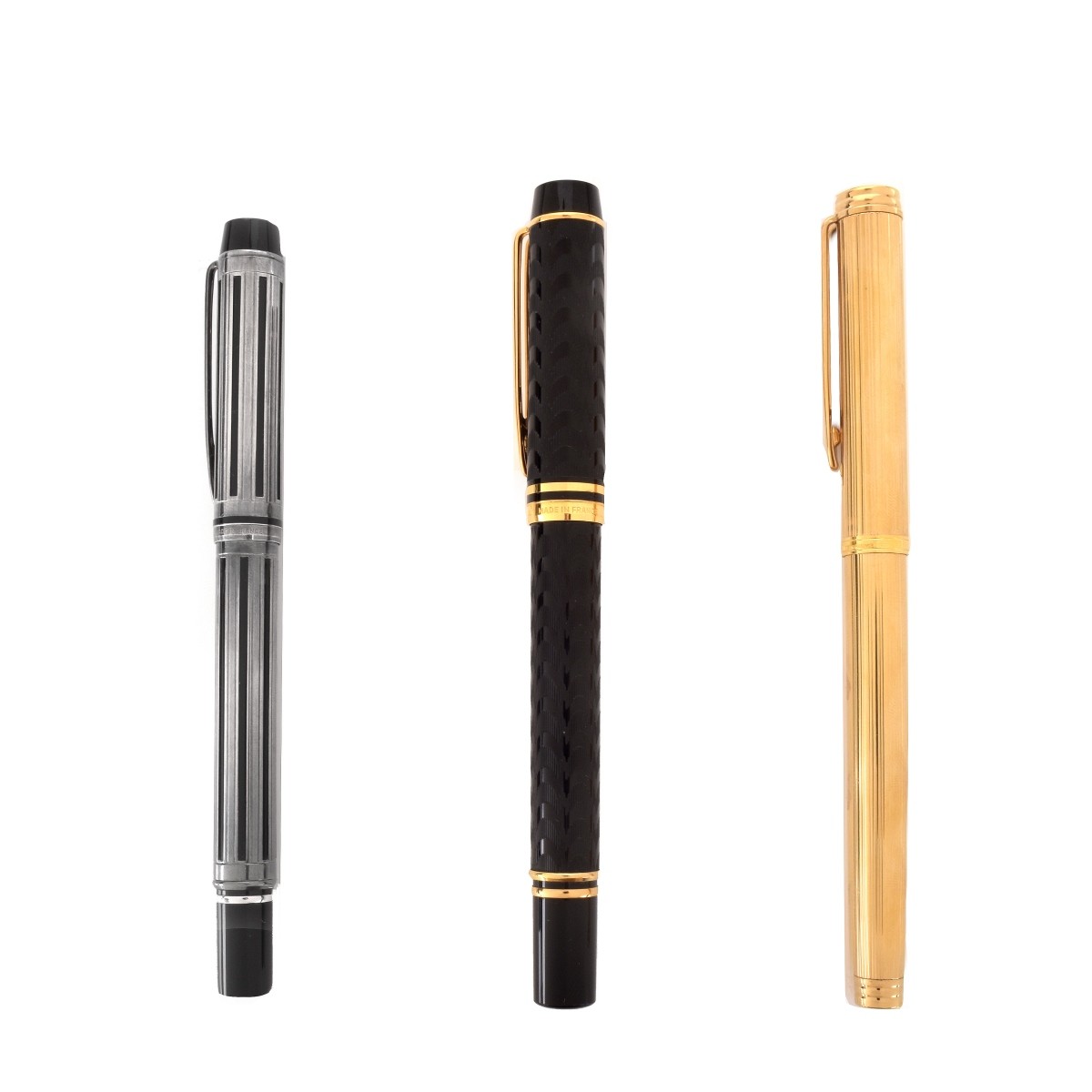 Three (3) Waterman Paris Fountain Pens, Gentleman's Gold 18kt nib 5-1/2" L, Ideal Black Chase 18kt Gold nib 5-5/8 L, and a Night & Day 18kt Gold nib 5-1/2" L , all in fitted original boxes with paperwork some have ink . Condition: Good condition, Estimate: $200.00 - $400.00 Domestic Shipping: $48.00