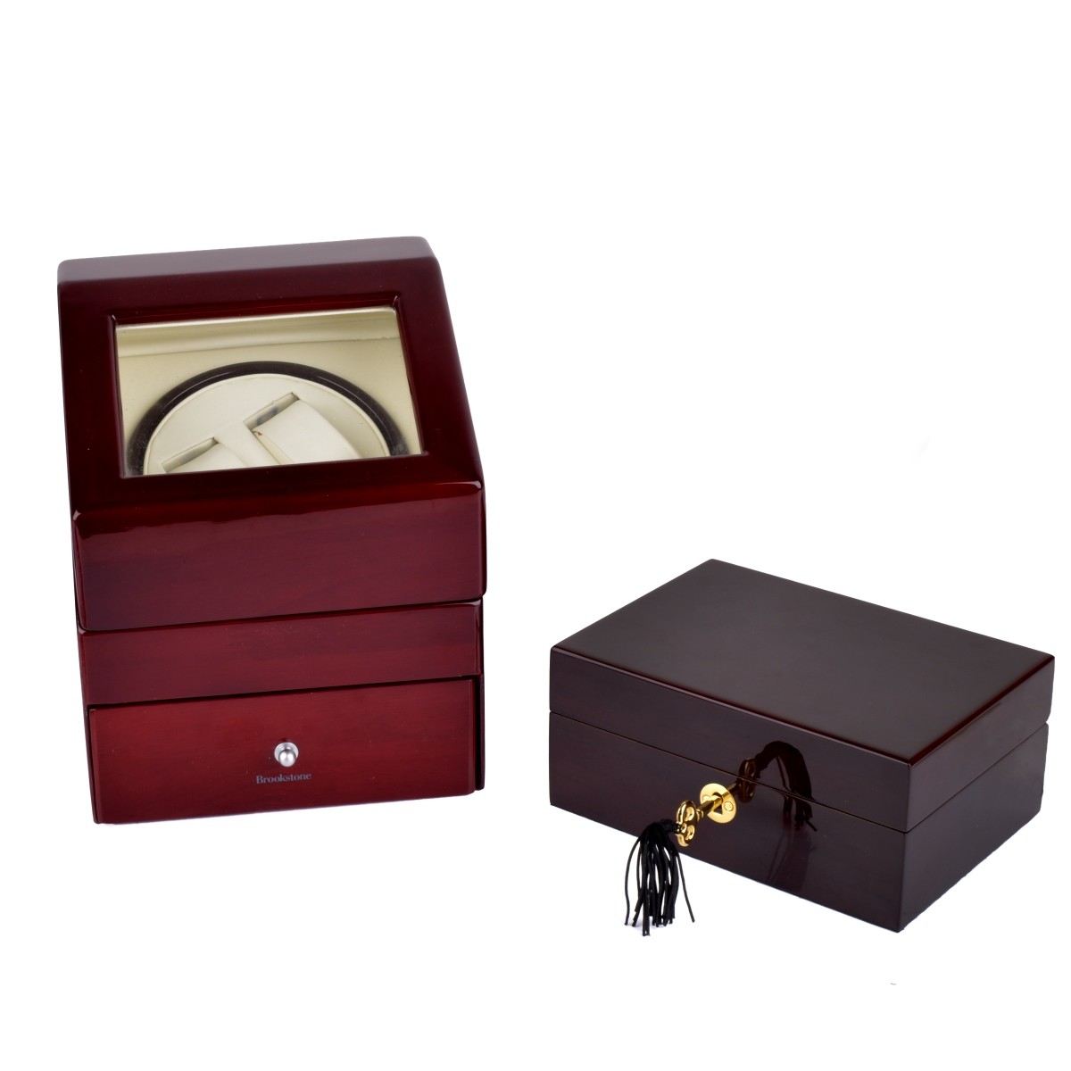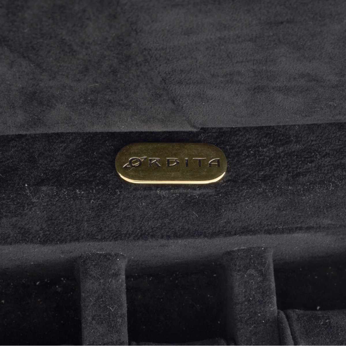 Two Wood Watch Display Boxes. One with electric two watch wind function and storage drawer for three watches, signed Brookstone. One with storage for three watches, signed Orbita. Brookstone measures 8-5/8" H, 7" W. Orbita measures 3-1/8" H, 7" Condition: Good condition. Some wear to lining fabric on Brookstone. Brookstone runs. No warranty as to running condition of electronics. Estimate: $100.00 - $150.00 Domestic Shipping: $85.00