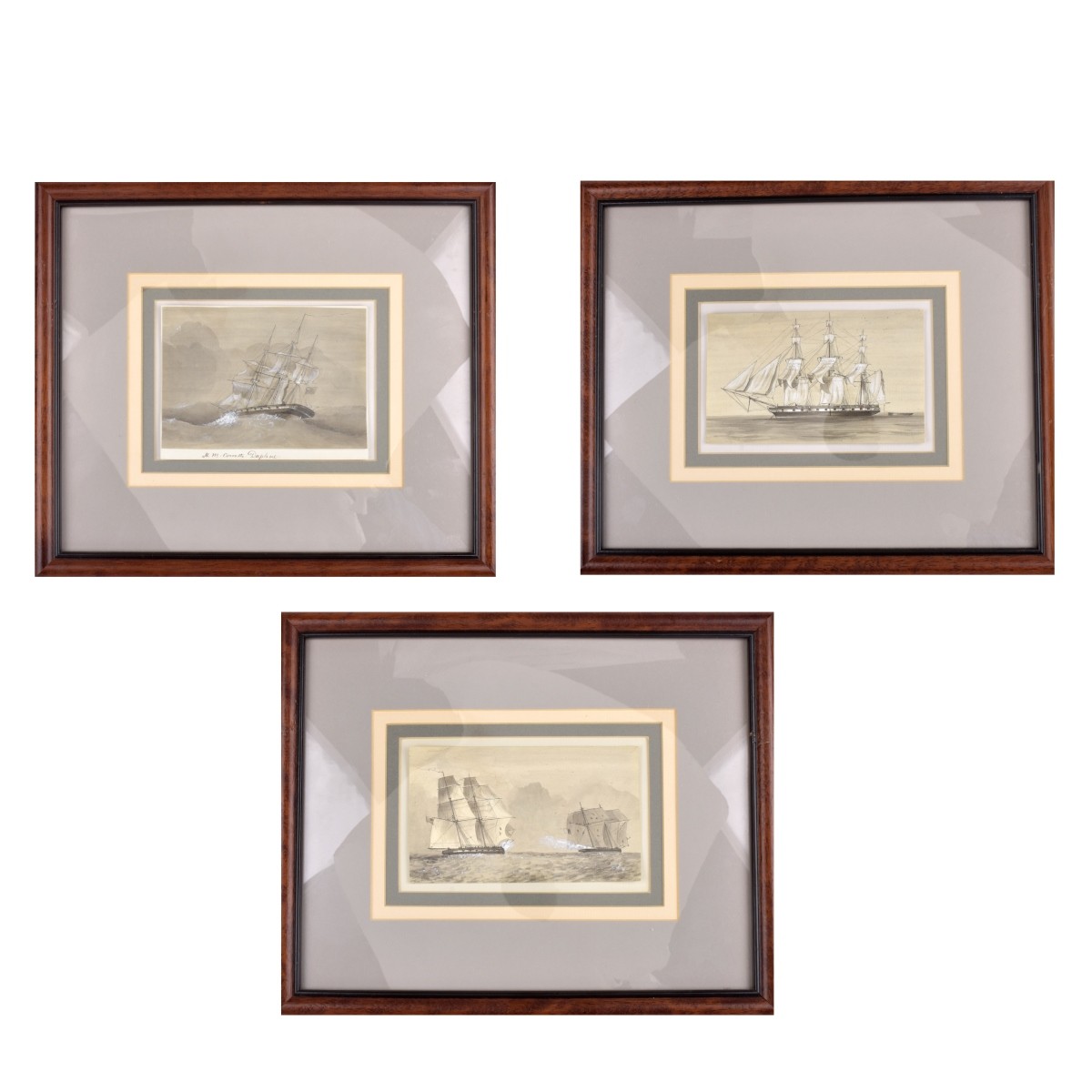 Lot of Three (3) British School Ink and Watercolor Paintings Naval Scenes. One is marked H. M. Corvette Daphne. Tallest frame measures 11-1/4" H x 13" W. Condition: Good condition Estimate: $100.00 - $300.00 Domestic Shipping: $85.00
