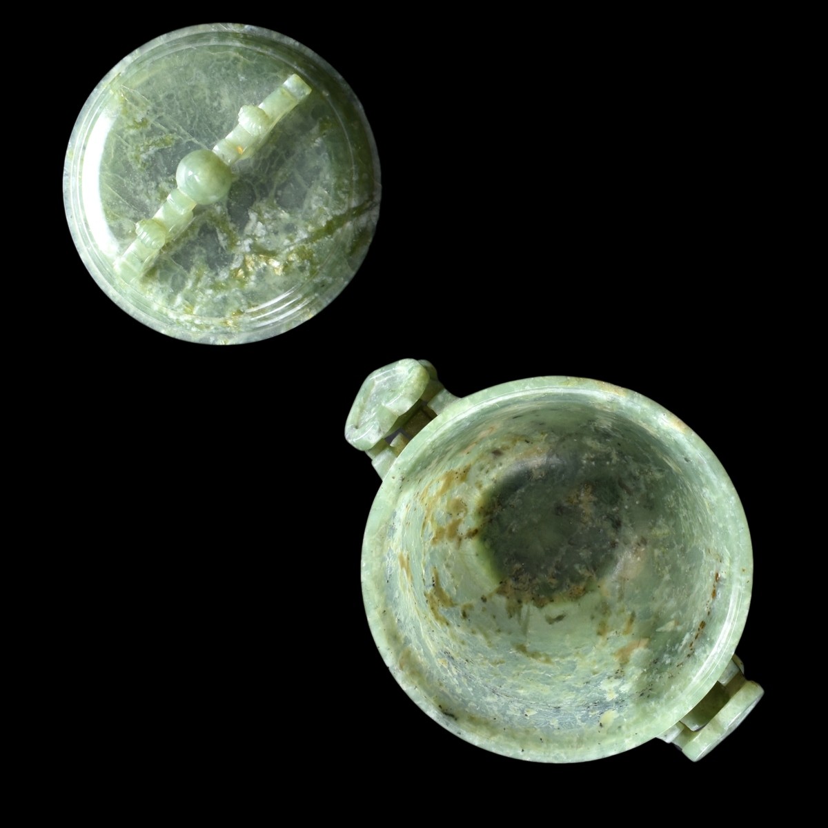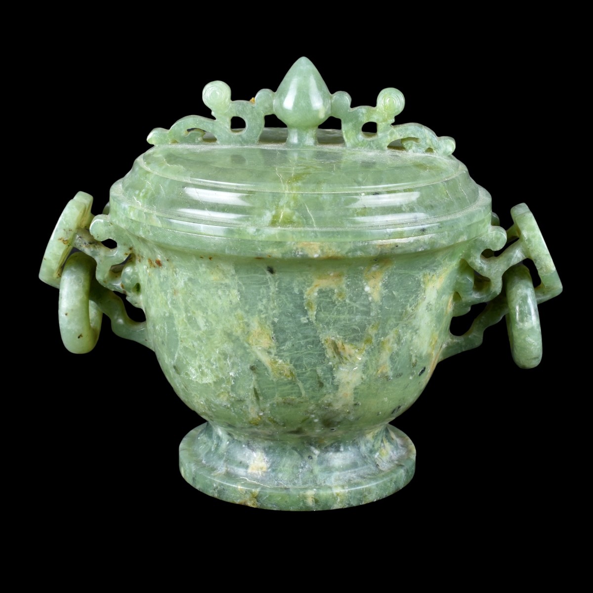Chinese Spinach Jade Covered Bowl with Handles. Unsigned. Measures 5" H x 6" W. Condition: Good condition Estimate: $200.00 - $300.00 Domestic Shipping: $55.00
