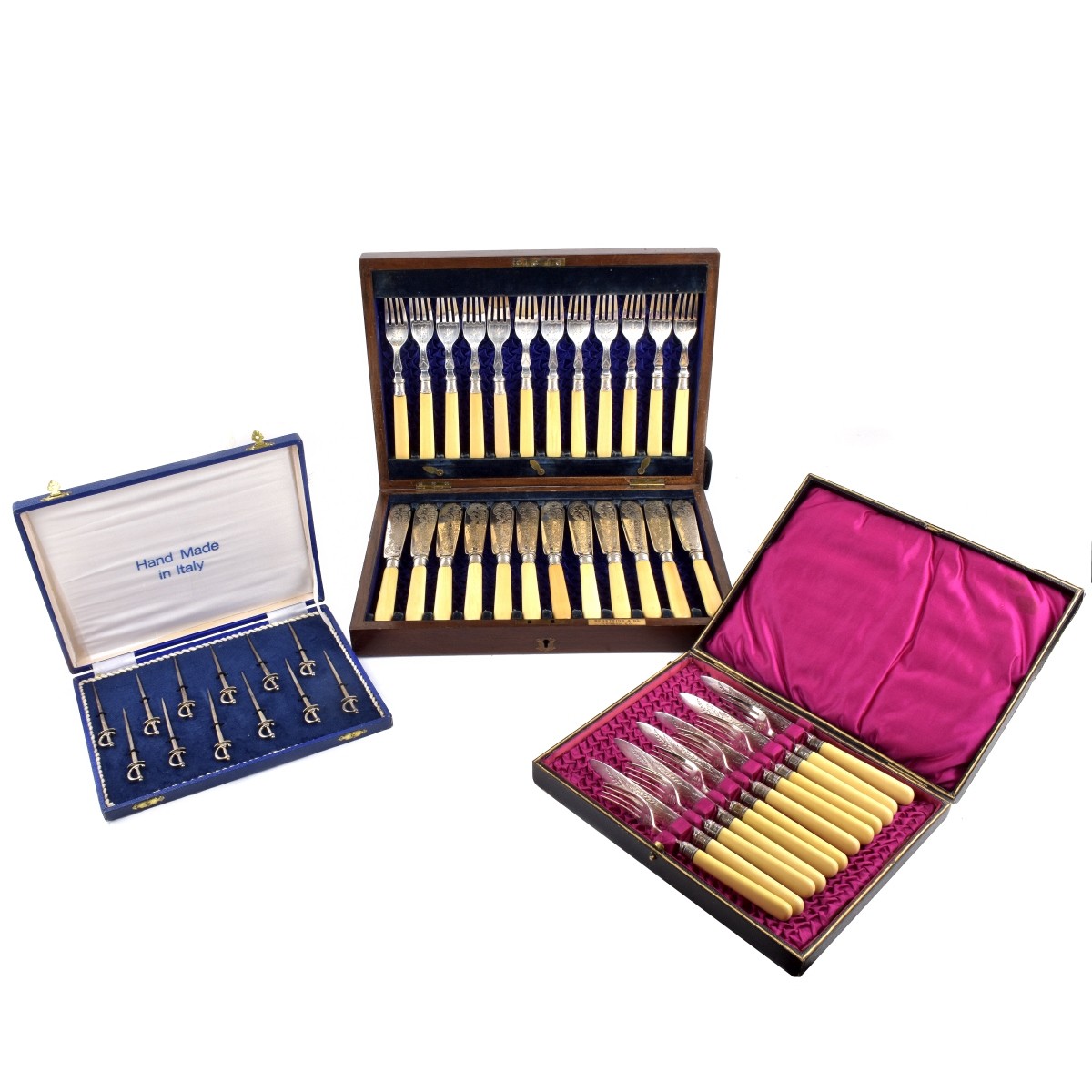 Three (3) Antique Ornate Fish, Fruit and Hors d'oeuvre Sets. 12 Sterling Italian Firenze 3-5/8" Swords 2.9 ozt. 12 English fruit forks and knives 7-5/8" , Mosely sterling band, cellulite handles1905. 12 English fish forks and knives 8-13/16" Sheffield, sterling band set. All in original fitted boxes. Condition: Good condition, needs a polish, one sword slightly bent. Fruit and fish set good. Original boxes a little beat up. Estimate: $200.00 - $400.00 Domestic Shipping: $92.00