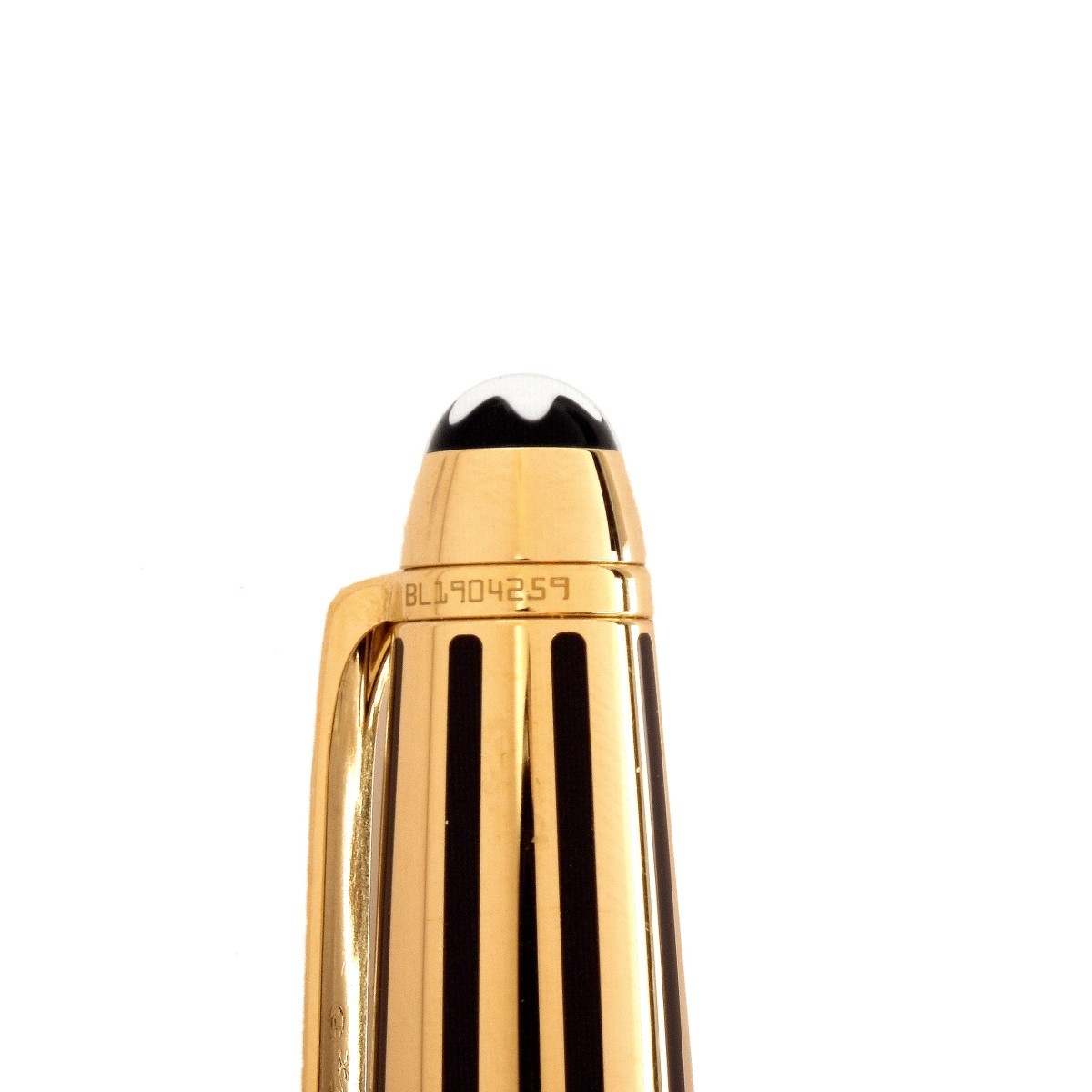 MontBlanc Meisterstuck Solitare Gold and Black Stripes Ballpoint Pen 35981. Along with a sample perfume individual. signed Montblanc Germany Meisterstuck numbered BL1904259, measures 5-1/2" Long, with original fitted box and a booklet. Condition: Good condition, has ink. Estimate: $100.00 - $200.00 Domestic Shipping: $35.00