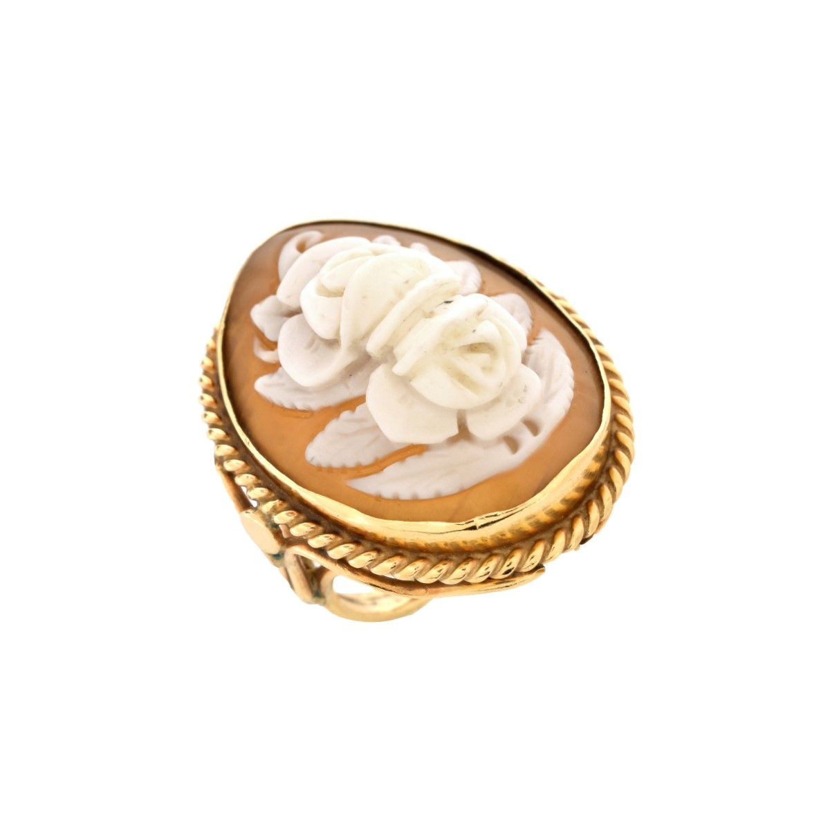 Vintage Carved Shell Floral Cameo and 14 Karat Yellow Gold Ring. Stamped 14K. Ring top measures 1-1/8" x 7/8". Ring size 7. Approx. weight: 12.2 grams. Condition: Good vintage condition. Estimate: $300.00 - $400.00 Domestic Shipping: $28.00