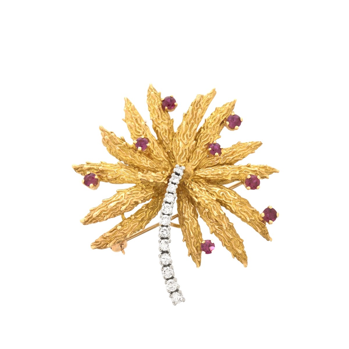 Vintage Round Brilliant Cut Diamond, Round Cut Ruby and 14 Karat Yellow Gold Spray / Tree Brooch. Signed JANFRERE 14K. Measures 1-7/8" H, 1-5/8" W. Approx. weight: 14.3 grams. Condition: Very good condition. Estimate: $300.00 - $400.00 Domestic Shipping: $20.00