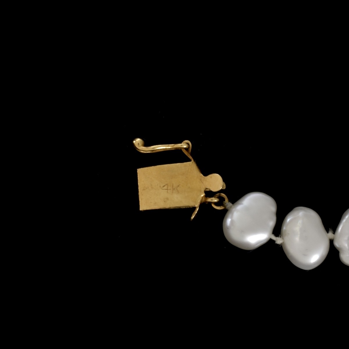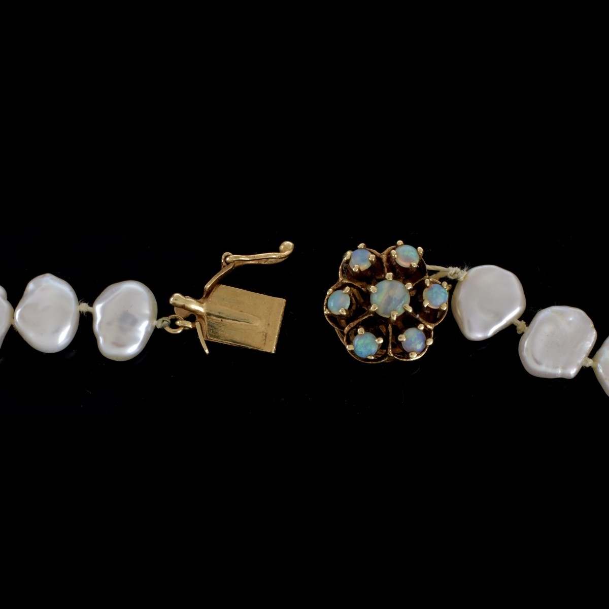 Vintage 62" Long Baroque Pearl Necklace with 14 Karat Yellow Gold and Small Opal Clasp. Stamped 14K. Pearls measure 7.0-9.0mm. Approx. weight: 84.7 grams. Condition: Good vintage condition. Needs to be reattached to clasp at one end. Estimate: $100.00 - $200.00 Domestic Shipping: $32.00
