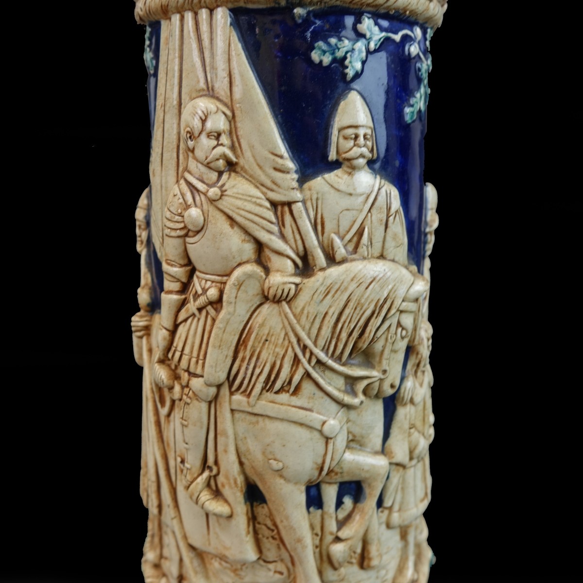 Grouping of a Large Antique German Beer Stein and Pitcher. Each with scenic raised relief. Stein is marked Germany, each is numbered to base. Pitcher measures 21-1/4" H, stein measures 13" H. Condition: Stein missing lid otherwise good condition Estimate: $200.00 - $300.00 Domestic Shipping: Third party