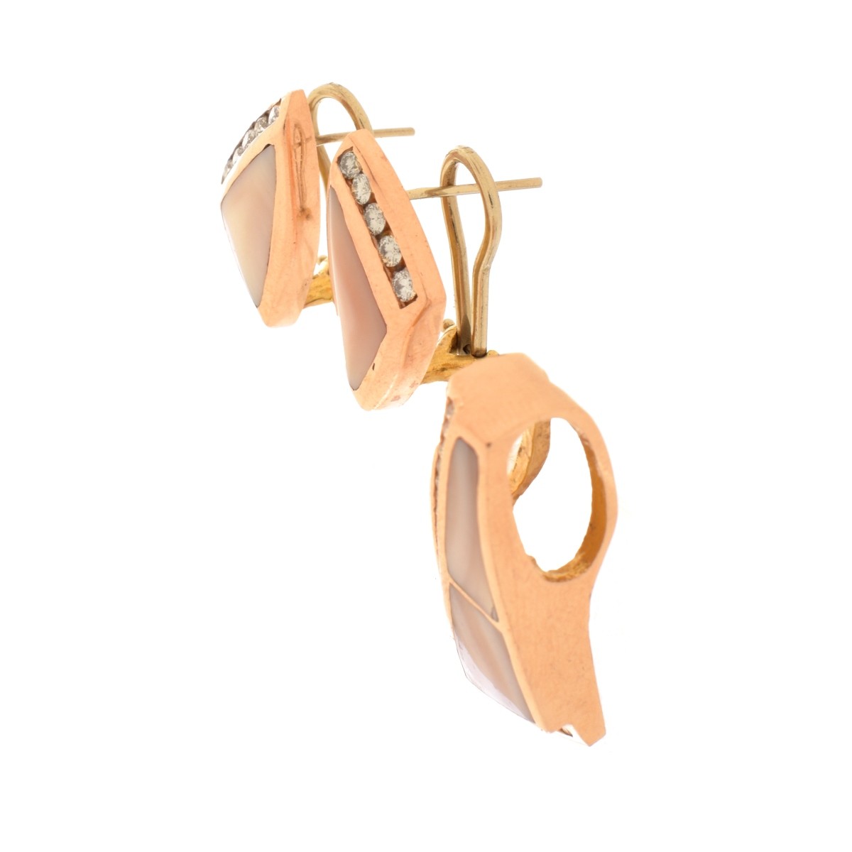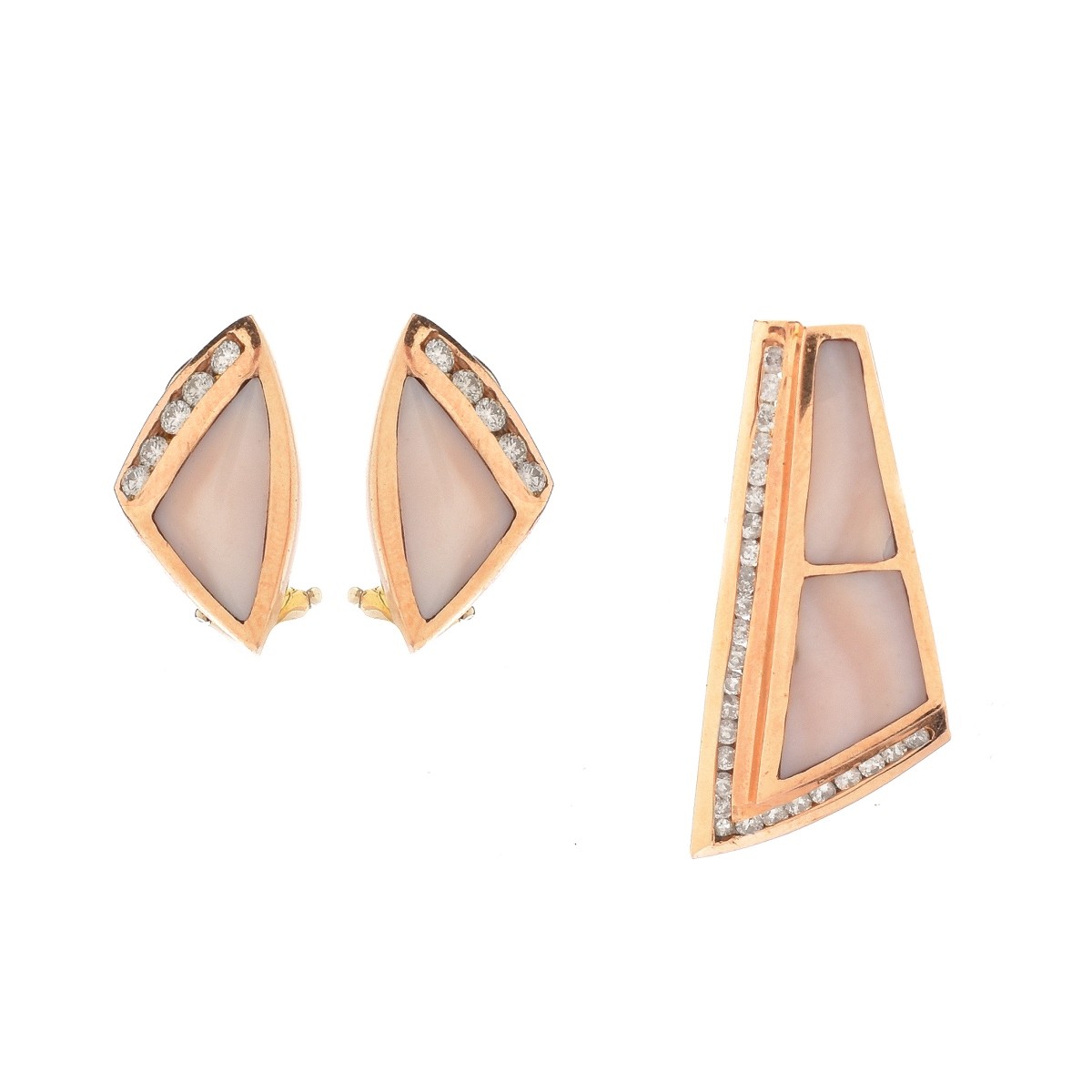Vintage Round Brilliant Cut Diamond, Onyx and 14 Karat Pink Gold Slide Pendant and Earrings Suite. Stamped 14K. Pendant measures 1-1/4" H, 5/8" W; earrings measure 3/4" H, 1/2" W. Approx. weight: 21.4 grams. Condition: Good vintage condition, light surface wear. Estimate: $300.00 - $500.00 Domestic Shipping: $30.00
