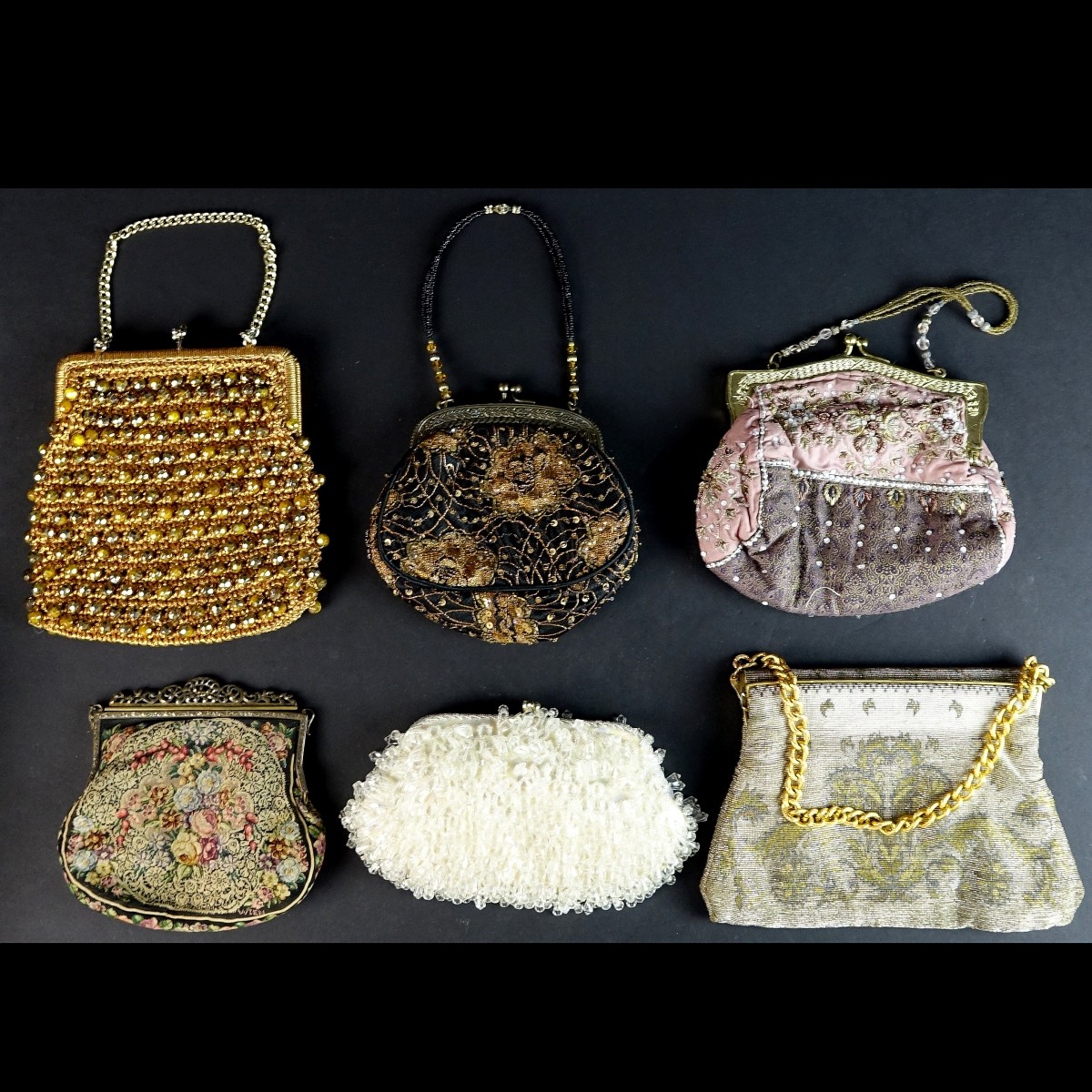 Collection of Six Vintage Ladies Evening Bags. Including white satin with clear crystal, made in Hong Kong; tapestry bag with matching pill box; gold lame with gold beads, Made in Japan; Two fabric bags with beading, signed Christiana and a Langlois & Jargeais, Paris metal bead bag with gold tone hardware. Gold lame bag measures 7-1/8" H, 7" W, white satin bag measures 4-1/2" H, 8" W; tapestry bag measures 6" H, 6-1/4" W. Condition: Used vintage condition. Chain missing from tapestry bag. bead losses to Christian bags. Rubbing, light soiling throughout. Estimate: $150.00 - $300.00 Domestic Shipping: $74.00