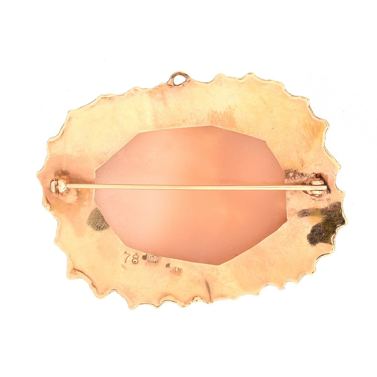 Vintage Carved Shell Cameo and 14 Karat Yellow Gold Pendant / Brooch. Stamped 14K MP 78. Measures 1-5/8" H, 2-1/4" W. Approx. weight: 17.6 grams. Condition: Good vintage condition. Estimate: $100.00 - $200.00 Domestic Shipping: $30.00