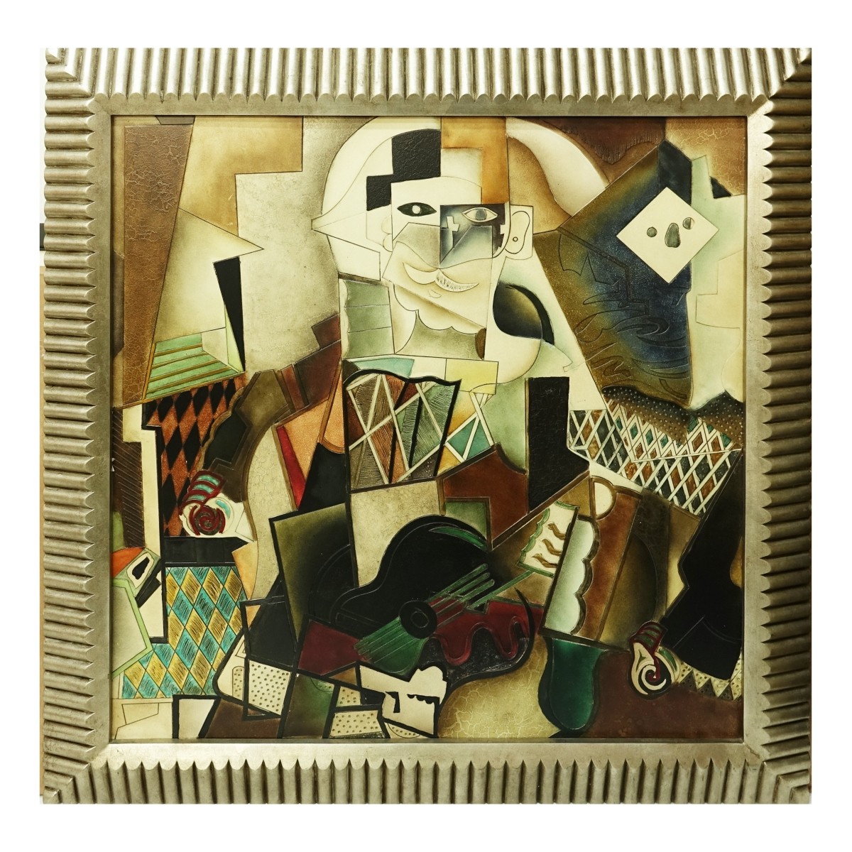 Large Mid Century Mixed Media on Panel, Still Life Cubist Abstract Composition, Unsigned. Depicts a portrait of a male figure holding a guitar. Sight measures 38" H x 38" W, frame measures 45-1/4" H x 45" W. Condition: Good condition Estimate: $200.00 - $400.00 Domestic Shipping: Third party