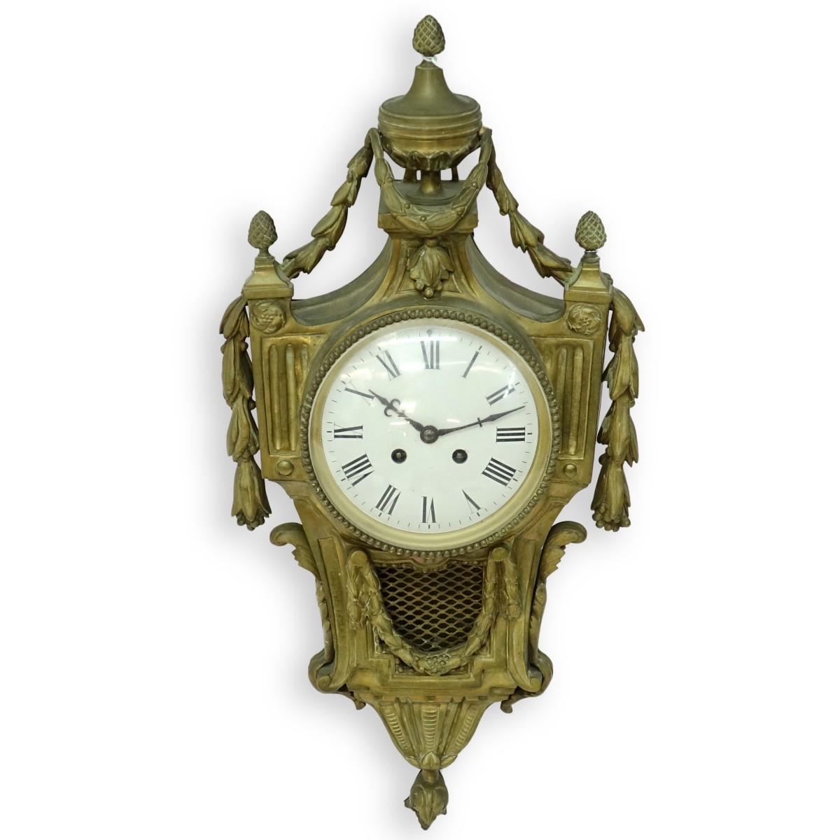 19th Century French Louis XVI Style Gilt Bronze Cartel Clock by Japy Freres. Marked on the movement. Roman numerals atop an enamel dial. Garlands and ribbons motifs with acorn finials. Pendulum and key included. Measures 23" H x 11" W. The gallery does not warranty the running condition of clocks. Condition: Rubbing to gilt otherwise good condition Estimate: $400.00 - $600.00 Domestic Shipping: Third party