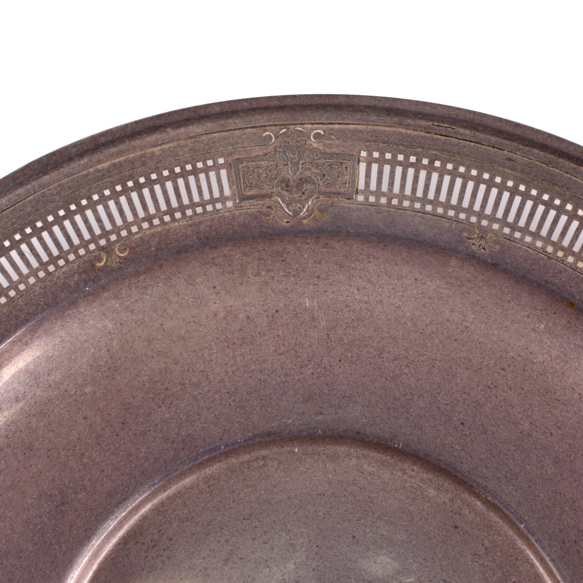 Meriden Britannia Co Pierced Sterling Silver Plate. Stamped and numbered 687 to base. Measures 11-3/8" diameter. Approx. weight: 13.66 troy ounces. Condition: Needs cleaning Estimate: $50.00 - $100.00 Domestic Shipping: $58.00