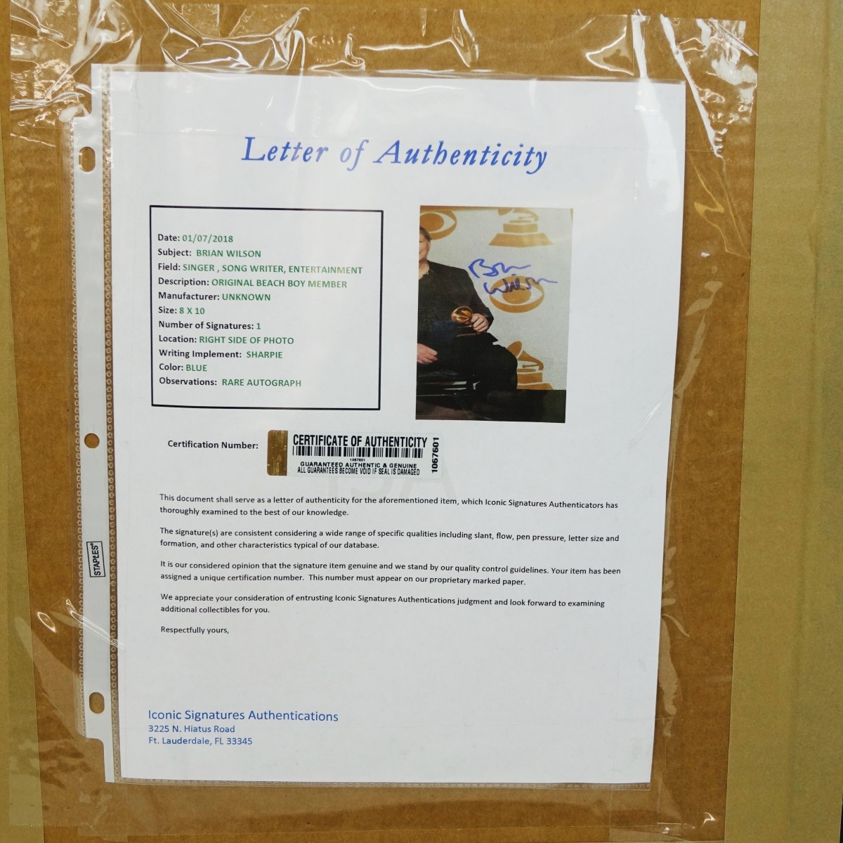 1988 Rock & Roll Hall of Fame, Brian Wilson "the Beach Boys" Signed Photographs. Tag affixed lower center. Letter of authenticity en verso. Frame measures 27-1/2" H x 17-1/2" W. Condition: Good condition Estimate: $50.00 - $150.00 Domestic Shipping: Third party