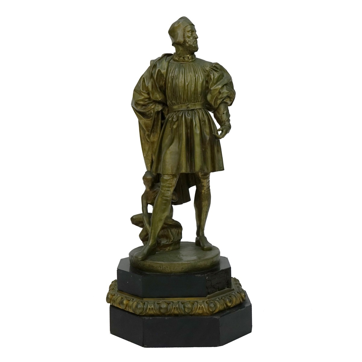 Jean-Jacques Feuchere, French (1807 - 1852) Patinated Bronze and Marble Sculpture "Benevento Cellini" Signed and Inscribed at the Base. Measures 20-1/4" H x 7-1/4" W, overall measures 25-1/2" H x 11-1/2' W. Condition: Chips and losses to marble base, missing urn at the left hand Estimate: $500.00 - $700.00 Domestic Shipping: Third party
