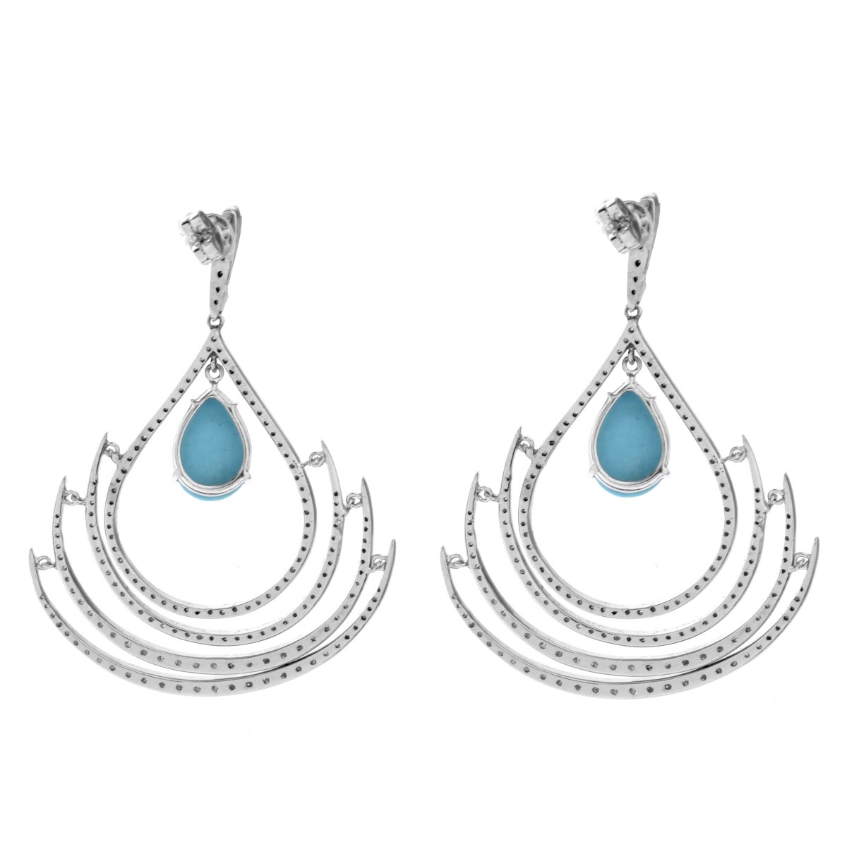 Approx. 3.90 Carat TW Pave Set Round Brilliant Cut Diamond, Pear Shape Persian Turquoise and 14 Karat White Gold Chandelier Earrings. Diamonds E-F color, VS clarity. Fine quality turquoise. Stamped 585. Measure 2-1/4" L, 1-5/8" W. Approx. weight: 19.9 grams. Condition: Very good condition. Estimate: $3500.00 - $4500.00 Domestic Shipping: $30.00