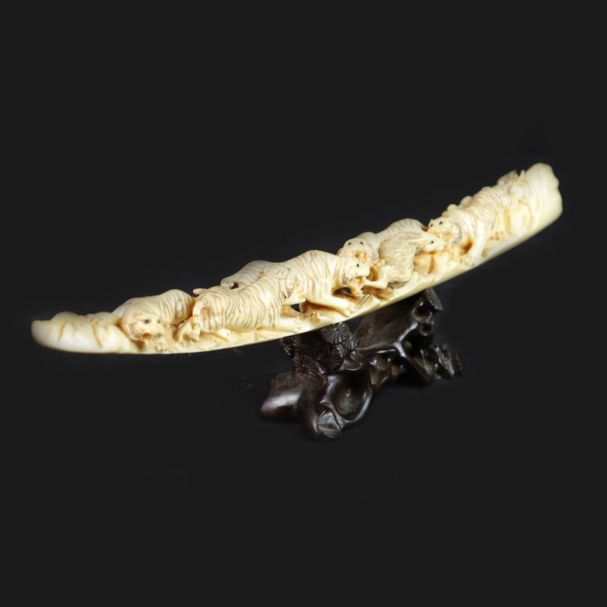Antique Japanese Polychrome Carved Relief Tusk on Carved Wooden Stand Depicting a Pack of Tigers Hunting a Prey. Carving measures 11-1/4" L. We Will Not Ship This Item Out of State of Florida. Anyone Having This Item Shipped Must Have a Florida Address or the Item will not be Shipped. Condition: Appears to have some normal losses at the base overall good condition Estimate: $200.00 - $400.00 Domestic Shipping: $58.00