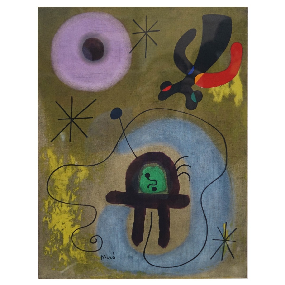 After: Joan Miro, Spanish (1893 - 1983) Colored Print on Paper "Mauve de la Lune, 1952" signed and numbered 259/300. Measures 16-1/2" H x 12-1/2" W, frame measures 42-1/4" H x 36-1/2" W. Condition: Good condition Estimate: $200.00 - $400.00 Domestic Shipping: Third party