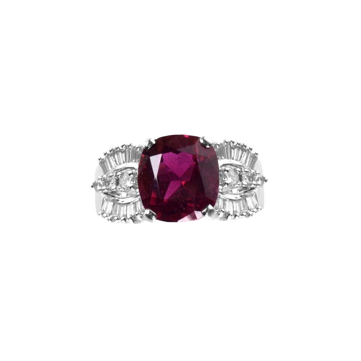 Gem Quality Approx. 9.0 Carat Oval Cut Rubelite Tourmaline, Approx. 1.30-1.40 TW Carat Baguette and Round Brilliant Cut Diamond and 14 Karat White Gold Ring. Rubelite with vivid color, measures 12.0mm x 11.0mm. Diamonds E-F color, VS1-VS2 clarity. Stamped 14K. Ring size 7. Approx. weight: 9.8 grams. Condition: Very good condition. Estimate: $600.00 - $800.00 Domestic Shipping: $28.00