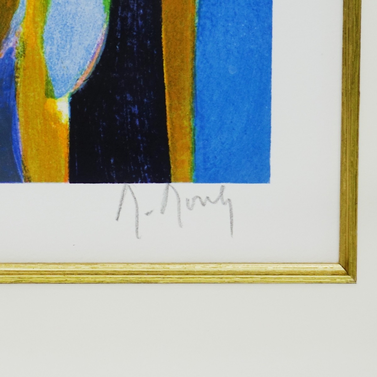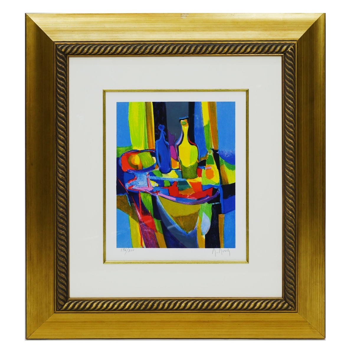 Marcel Mouly, French (1918 - 2008) Color Lithograph on Paper "Le Bouteille Juane" Signed and Numbered 176/300. Measures 12" H x 9-1/2" W, frame measures 27-1/2" H x 25" W. Condition: Good condition Estimate: $100.00 - $200.00 Domestic Shipping: $145.00