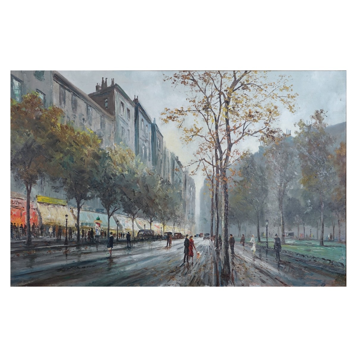 20th Century French School Oil on Canvas "Parisian Street Scene" Unsigned. Measures 24" H x 36" W, frame measures 31-1/2" H x 43-1/2" W Condition: Good condition Estimate: $100.00 - $200.00 Domestic Shipping: Third party