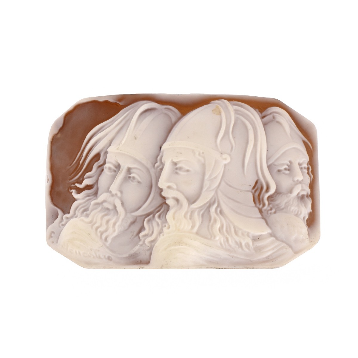 Antique Finely Carved Shell Cameo of Soldiers after: Peter Paul Rubens. Measures 1-3/8" H, 2-1/4" W. Approx. weight: 10.8 grams. Condition: Very good condition. Estimate: $100.00 - $200.00 Domestic Shipping: $28.00