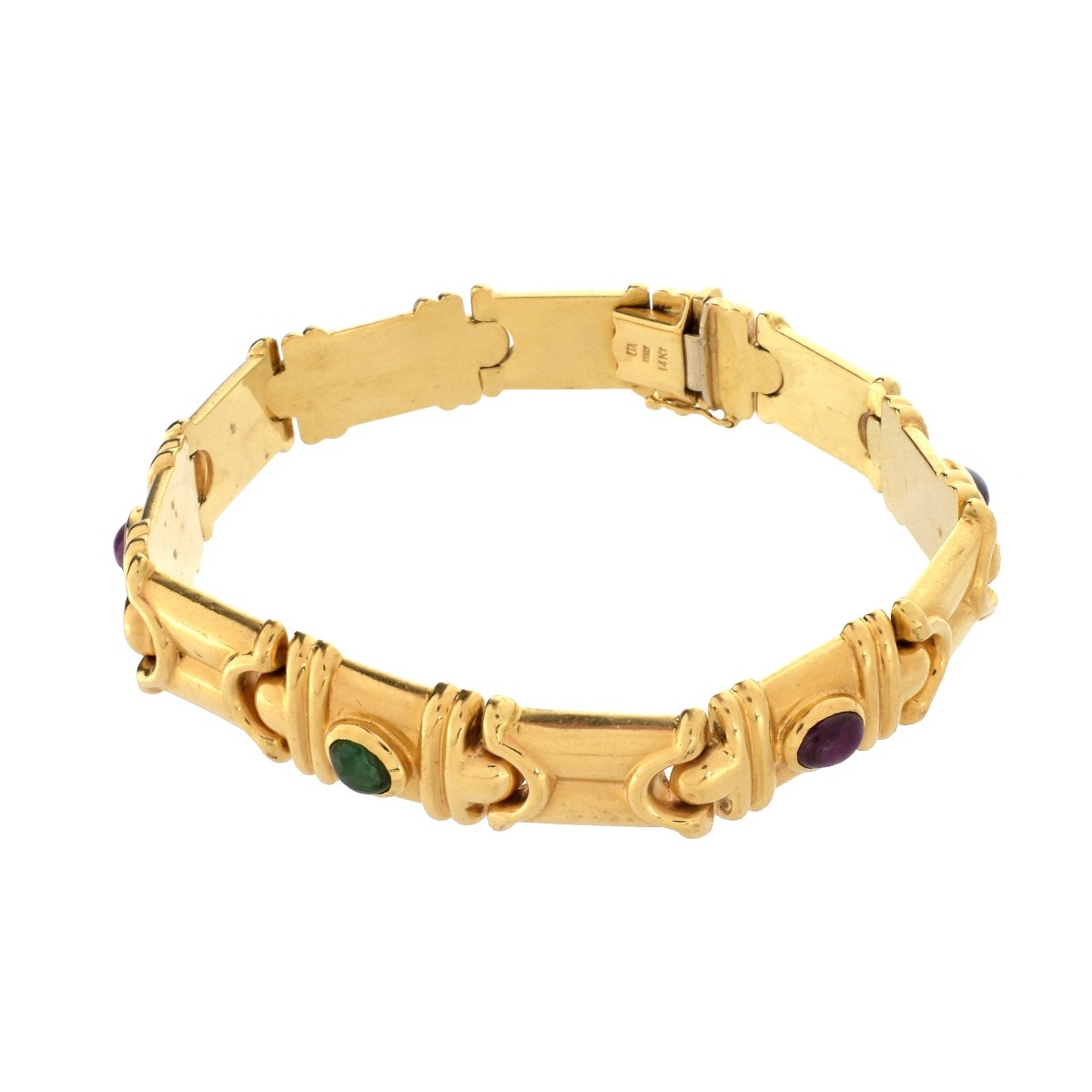 Italian Five Cabochon Multi Gemstone and 14 Karat Yellow Gold Flexible Link Bracelet. Stamped Italy 14KT. Measures 7-1/2" L, 3/8" W. Approx. weight: 22.9 grams. Condition: Very good vintage condition. Slight surface wear. Estimate: $200.00 - $500.00 Domestic Shipping: $30.00