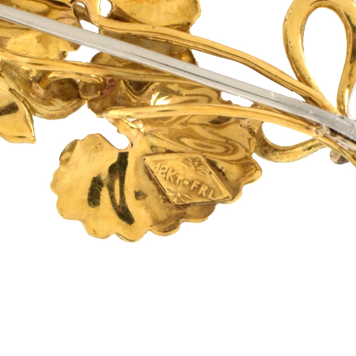 Delicate 18 Karat Yellow Gold and Enamel Cyclamen Bouquet Brooch. Stamped 18KT FRL. Measures 1-1/4" L, 1" W. Approx. weight: 8.3 grams. Condition: Very good condition. Estimate: $100.00 - $150.00 Domestic Shipping: $28.00