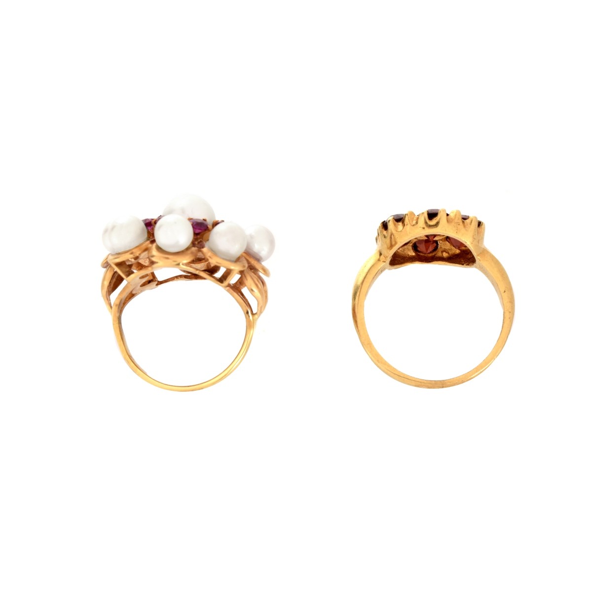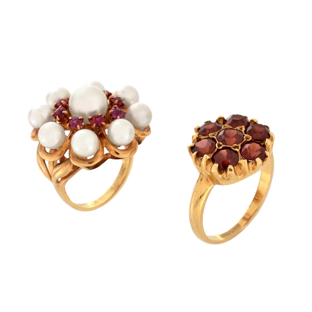 Two Vintage Gemstone and 14 Karat Yellow Gold Rings. One set with seven round cut garnets, the other with eight small round cut rubies and nine pearls. Largest pearl measures 6mm. Rubies with vivid color. One stamped 14K. Ring sizes 2, 5-1/4. Pearl ring top measures 3/4" diam. Approx. weight: 8.0 grams. Condition: Very good condition. Estimate: $100.00 - $300.00 Domestic Shipping: $30.00