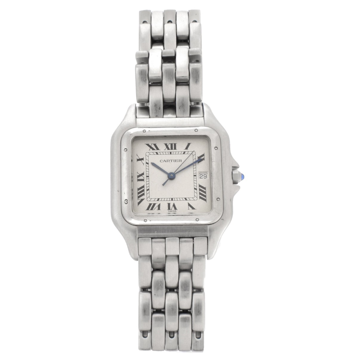 Men's Vintage Cartier Panthere Stainless Steel Bracelet Watch with Quartz Movement. Case measures 39mm x 29mm. With Box and Papers. Signed and numbered 1300 C 70770. Bracelet measure 7" L. Condition: Good vintage condition. Needs a battery. Moderate surface wear and scratches from normal use. Please note the gallery does not warranty the running condition of watches. Estimate: $800.00 - $1200.00 Domestic Shipping: $34.00