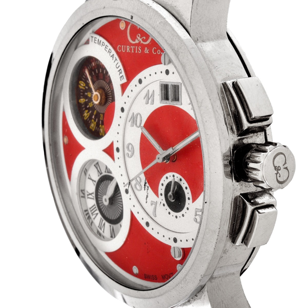 Curtis & Co. Big Time World Stainless Steel Watch with Leather Strap, Two Time Zones and Temperature, Swiss Quartz Movement. Case measures 57mm, strap measures 10" L. With Box and two additional leather straps. Condition: Surface wear from normal use. Wear to red strap, black and brown straps "As New". Needs a battery. Please note the gallery does not warranty the running condition of watches. Box "As Is". Estimate: $400.00 - $600.00 Domestic Shipping: $36.00