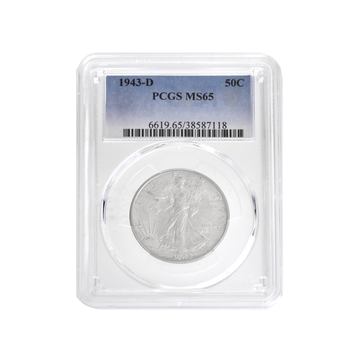 1943-D Walking Liberty Silver Half Dollars in Slabbed Case. Reverse: walking liberty. Obverse: eagle with raised wings. Designer: Adolph A. Weinman. Diameter: 30.6mm. Weighs:12.5 grams. Condition: MS-65 Estimate: $50.00 - $500.00 Domestic Shipping: $28.00