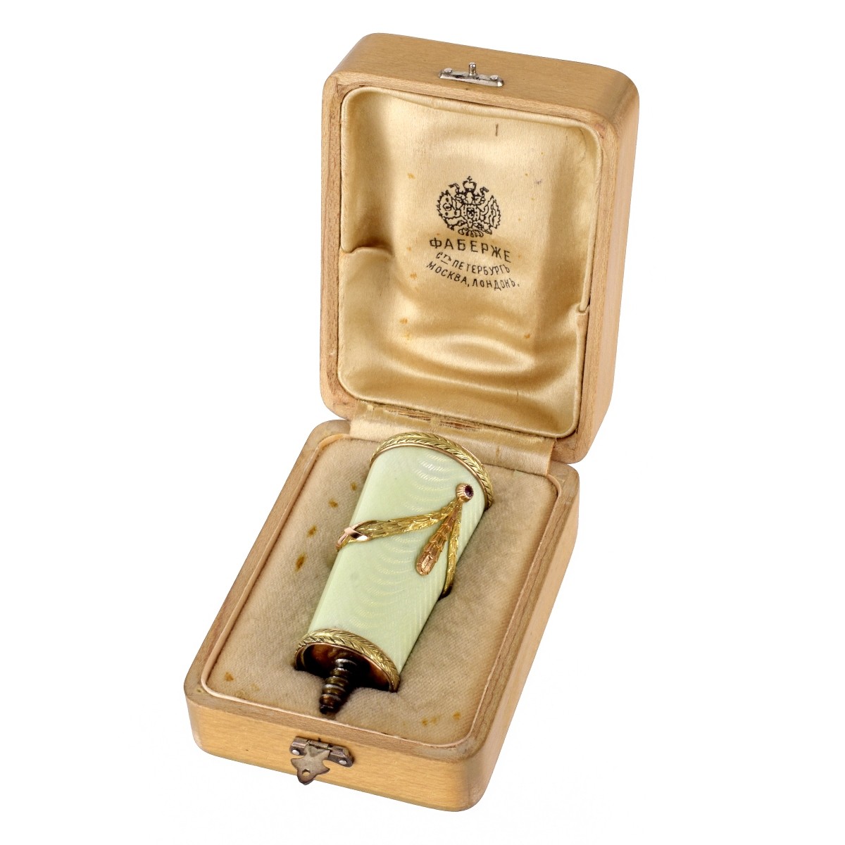 Circa 1908-1917 Russian Faberge Gemstone and Varicolor 56 Gold (14K) and Guilloche Enamel Parasol Handle. 56 gold standard mark, mark of Faberge workmaster Henrik Wigstrom, St. Petersburg (1908-1917). With fitted box stamped Faberge (cyrillic). Measures 2-1/8" H, 7/8" W. Approx. weight: 42.7 grams. Provenance: Sotheby's Important Russian Works of Art April 8,2014 Lot 6. Condition: "As Is" condition. Losses to enamel. Damaged at Sotheby's post auction. Estimate: $3000.00 - $5000.00 Domestic Shipping: $30.00