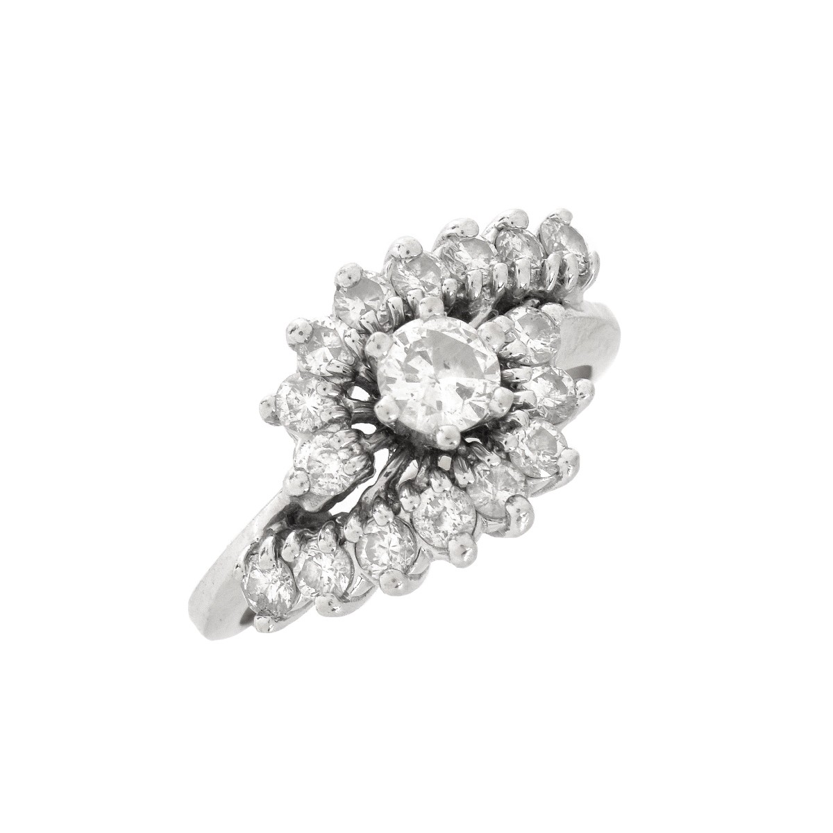Vintage Approx. 1,25 Carat TW Round Brilliant Cut Diamond and 14 Karat White Gold Cluster Ring. Diamonds F-G color, SI1-SI2 clarity. Stamped 14K. Ring size 5-1/4. Approx. weight: 4.7 grams. Condition: Good vintage condition. Estimate: $150.00 - $250.00 Domestic Shipping: $28.00