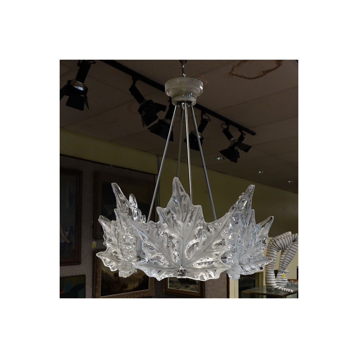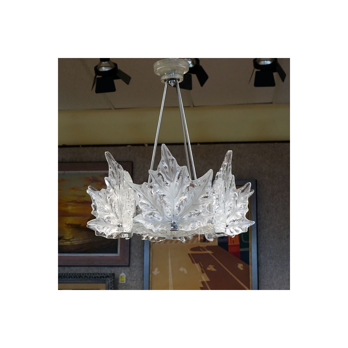 Lalique "Champ Elysees" Chrome, Clear and Frosted Crystal Chandelier. Signed. Overall height: 22" H, 23" Dia. Condition: Good condition, 3 small chips on interior portion of the socket, not visible until taken apart. Estimate: $3000.00 - $5000.00 Domestic Shipping: Third Party