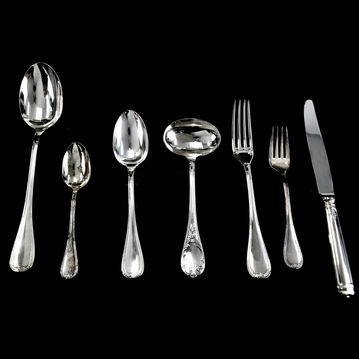 Forty Two (42) pieces Christofle France Malmaison Flatware, 8 knives 9-3/4" , 8 forks 8-1/8", 8 salad forks, 8 spoons, 8 soup spoons, 1 ladle 7" , 1 serving spoon 9-7/8" Condition: Good condition, light scratching from use, wear consistent with age and history. Estimate: $300.00 - $500.00 Domestic Shipping: $88.00