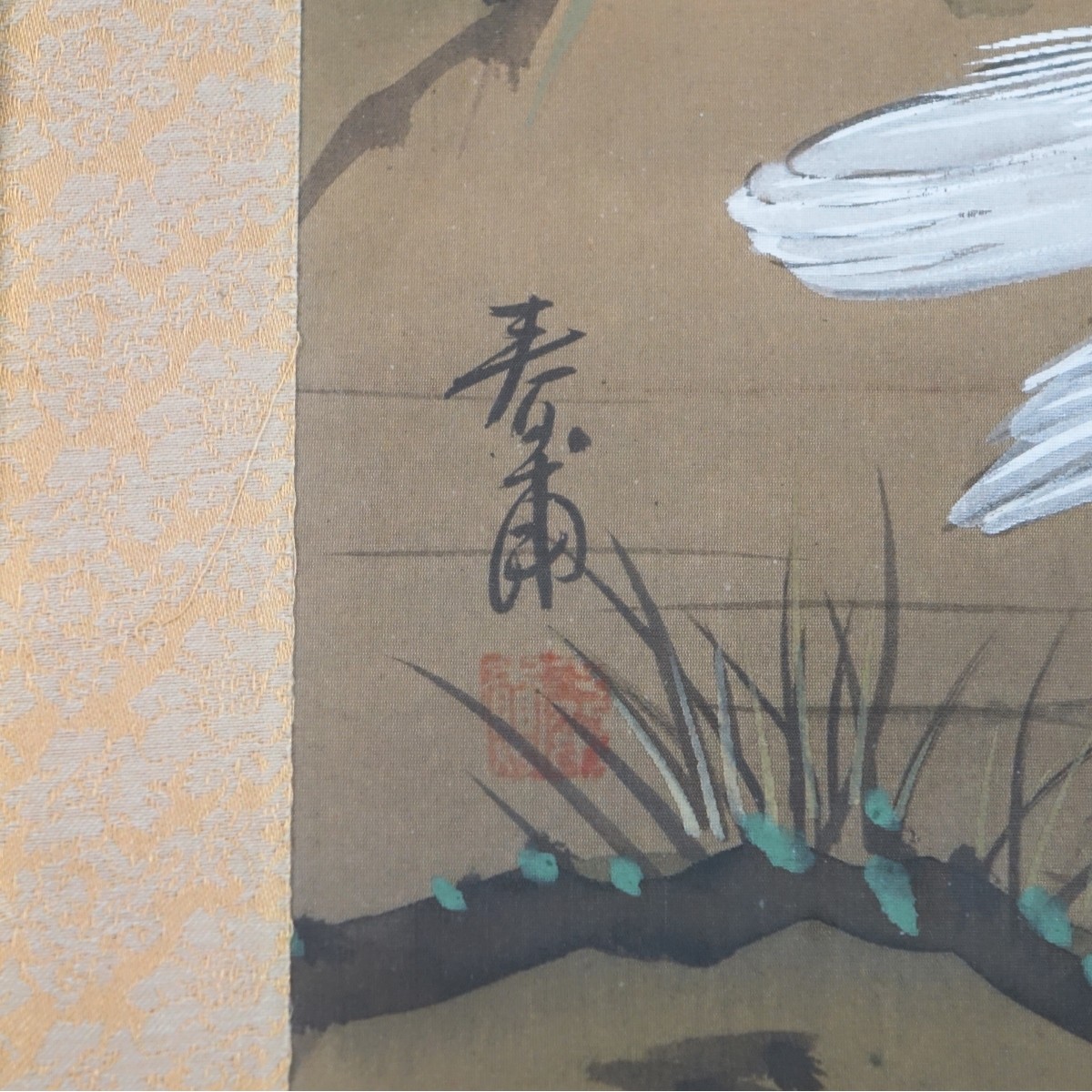 Pair Antique Japanese Framed Scroll Paintings, White Egrets. signed lower right and left both with red mark, tag to verso artist Puto, each measures sight 41" H x 16" W frame 50-1/4" H x 22" W Condition: Good condition, wear consistent with age and history. Estimate: $200.00 - $400.00 Domestic Shipping: Third Party