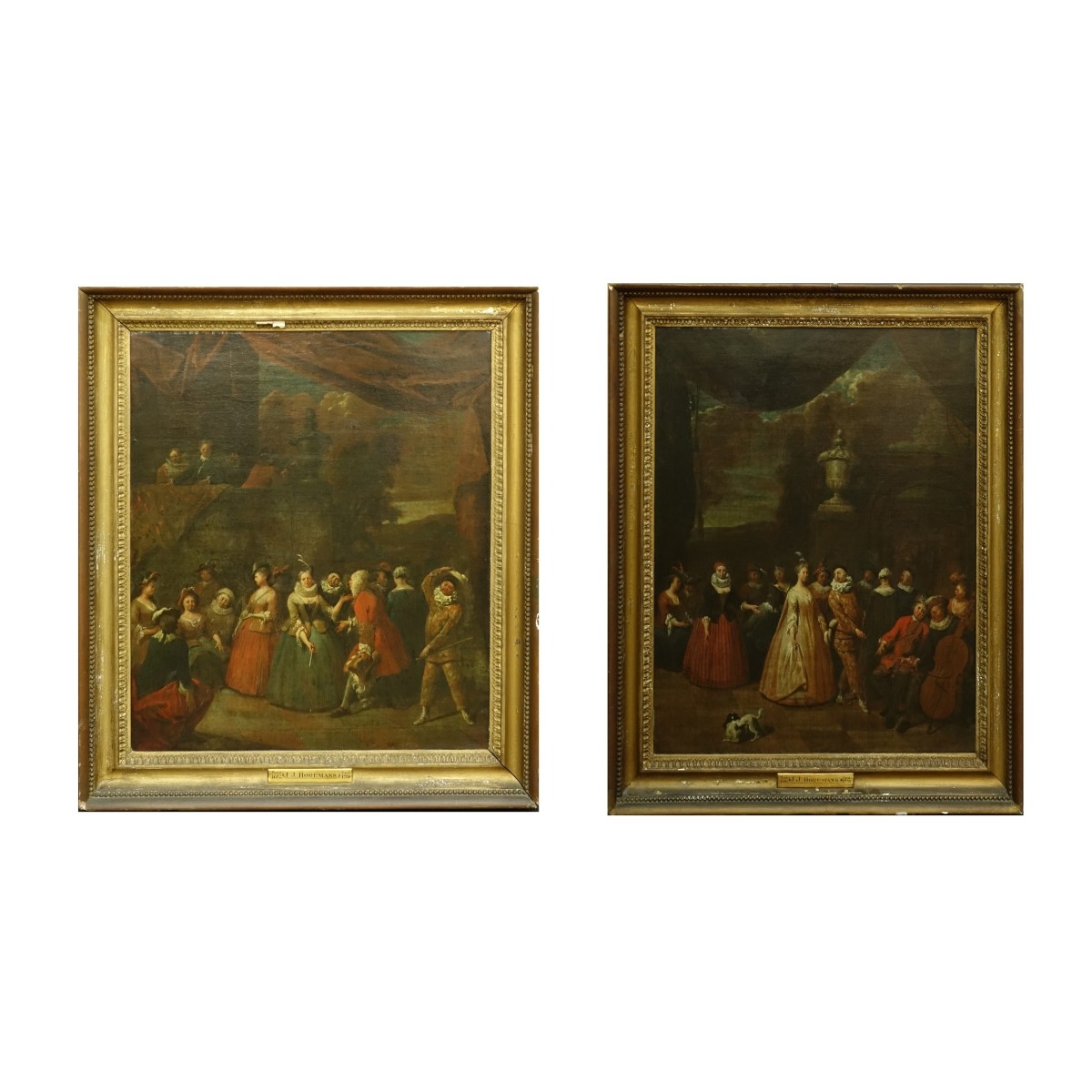 Jan Josef Horemans the Elder, Flemish (1682 - 1759) Pair of Oil on Canvas Paintings "Interior Scenes: Musicians and Comedians Before Elegant Spectators" Each with Signatures Associated on Frame. Includes an Original Sotheby's Auction appraisal executed by Lark E. Mason, Jr. Remnants of an old label attached en verso. Measures 23" H x 19-3/4" W, frame measures 27-3/4" H x 24" W. Condition: Darkening to paint, craquelure otherwise good condition Estimate: $4000.00 - $6000.00 Domestic Shipping: Third party