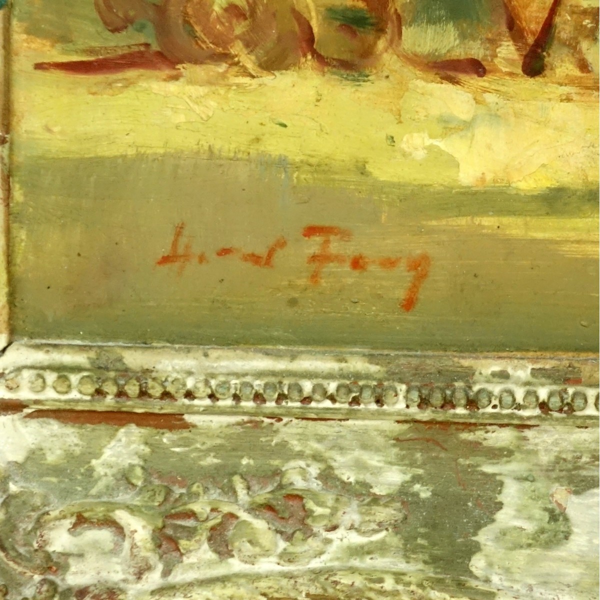 20th Century Oil on Masonite, Abstract Outdoor Park Scene with Figures, Signed Lower Left. Measures 15" H x 17-3/4" W, frame measures 20-1/4" H x 23" W. Condition: Good condition Estimate: $50.00 - $100.00 Domestic Shipping: $125.00