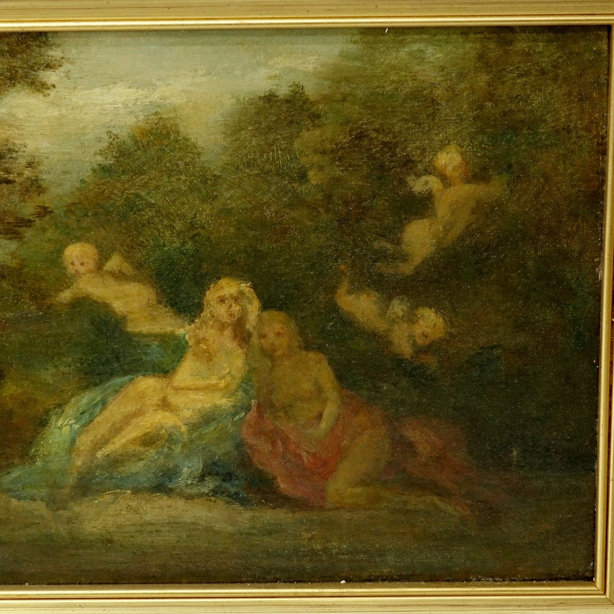 Emile Diaz de la Pena, French (1835 - 1860) Oil on canvas "Femmes et Amours". Signed lower left. Measures 9-1/2" x 13-3/4", Frame measures 23" x 26-1/2". Condition: Good conserved condition. Losses to frame. Estimate: $800.00 - $1200.00 Domestic Shipping: Third party