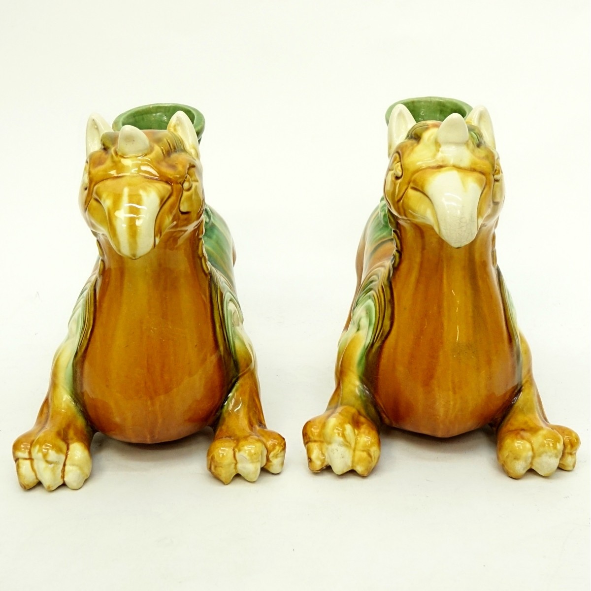 Pair of Chinese Tang Dynasty Style Glazed Pottery Dragon Figures/Vessels. Unsigned. Measures 10-1/8" H x 7-1/2" W x 11-3/4" L. Condition: Crazing otherwise good condition Estimate: $50.00 - $100.00 Domestic Shipping: Third party