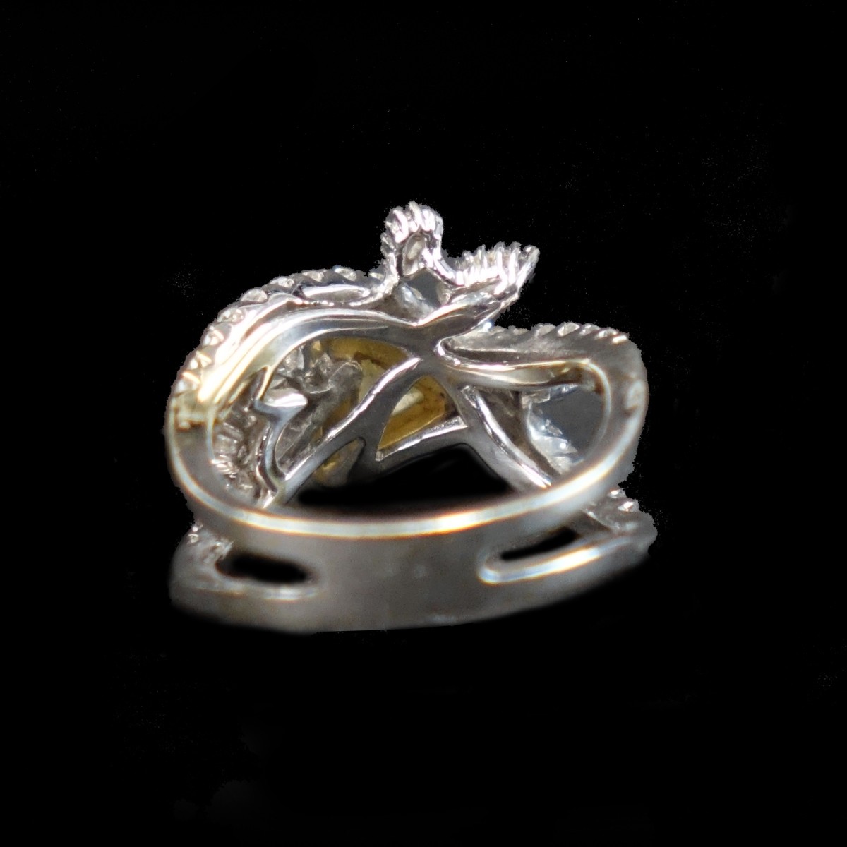 Approx. .30 Carat Triangular Shape Fancy Yellow Diamond, 1.0 Carat TW Multi Cut White Diamond and 18 Karat White Gold Ring. Yellow diamond SI2 clarity. White diamonds E-F color, VS-VS2 clarity. Stamped 18K. Ring size 7. Approx. weight: 8.4 grams. Condition: Very good condition. Slight surface wear. Needs cleaning. Estimate: $1500.00 - $2500.00 Domestic Shipping: $28.00