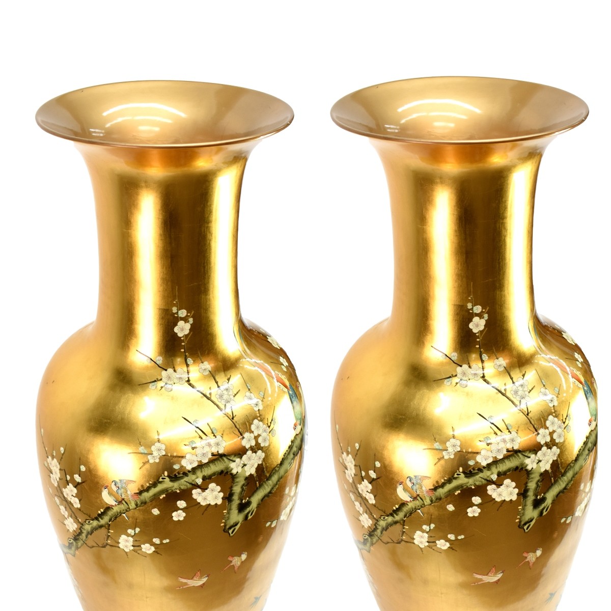 Pair of Monumental Size Modern Chinese Gold Leaf and Hand Painted Porcelain Vases on Wooden Stands. Baluster form with perched birds, blossoms and chrysanthemum flowers. Measures 62-3/4" H x 21" W, stands measures 3" H x 16" dia. Condition: One or two normal very small nicks to the leaf at the rim otherwise good condition Estimate: $2000.00 - $4000.00 Domestic Shipping: Third party