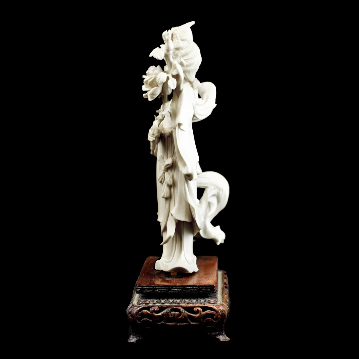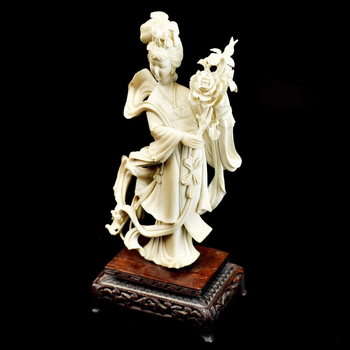 Antique Chinese Carved Guanyin Figurine Mounted on Wooden Base. Box included. Unsigned. Measures 8-1/2" H x 4-/2" W, box measures 3" H x 9-1/4" W x 7-1/4" D. We Will Not Ship This Item Out of State of Florida. Anyone Having This Item Shipped Must Have a Florida Address or the Item will not be Shipped. Condition: Good condition Estimate: $200.00 - $300.00 Domestic Shipping: $62.00