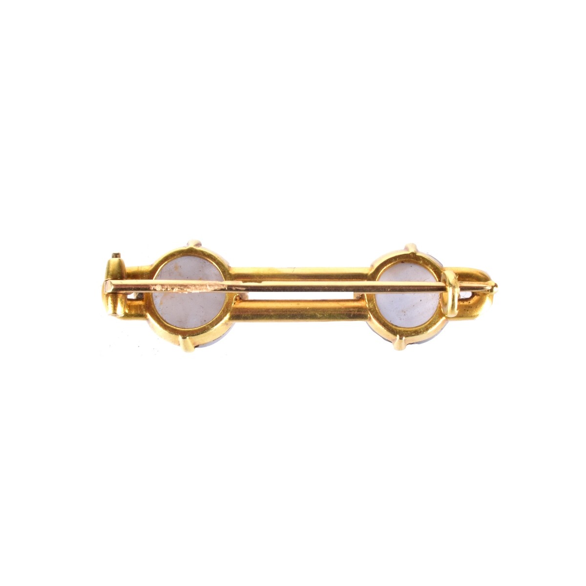Antique Russian Moscow two Cabochon Star Sapphire and 56 Gold (14K) Bar Brooch. Stamped 56 and the mark of assayer Nikolay Nikolayevitsh Korbitsky working in Moscow 1886-1887. Indistinct second mark, possibly maker. Larger sapphire measures 11.0mm diam. Measures 1-9/16" L, 3/8" W. Approx. weight: 8.4 grams. Condition: Very good antique condition. Estimate: $1000.00 - $2000.00 Domestic Shipping: $30.00