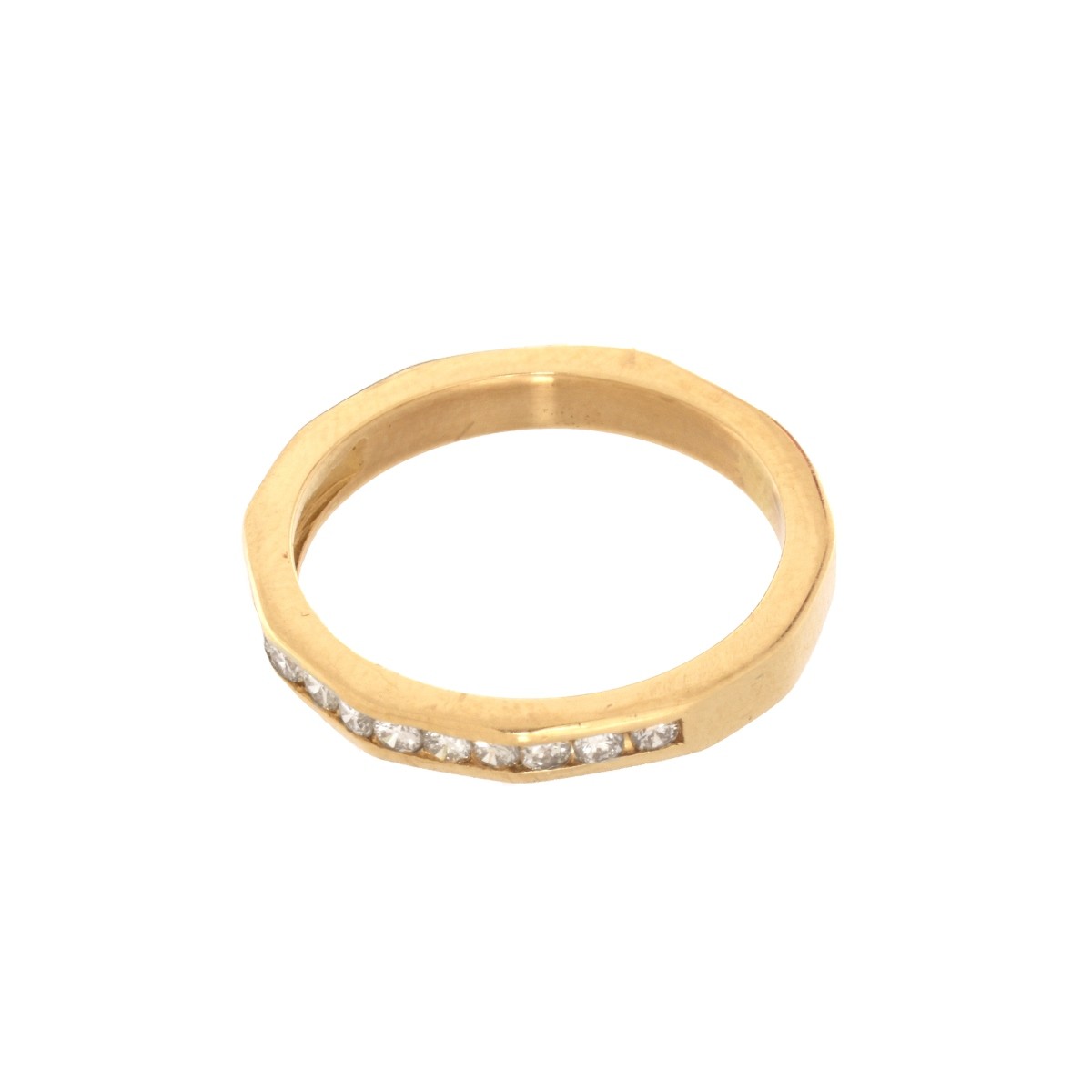 Approx. .50 Carat TW Twelve Channel Set Round Brilliant Cut Diamond and 14 Karat Yellow Gold Band / Ring. Diamonds F-G color, VS1-VS2 clarity. Stamped 14K. Ring size 6. Approx. weight: 2.9 grams. Condition: Very good condition. Estimate: $100.00 - $200.00 Domestic Shipping: $28.00