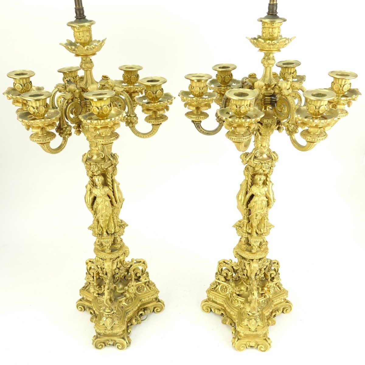 Pair of Impressive French Napoleon III Style Gilt Bronze Figural Six Light Candelabra. Three figures encircling the stem with intricate flowers and leaves decor. Measures 37-3/4" H x 12-3/4" W. Condition: Rubbing, Repair to one arm, needs to be rewired otherwise good condition. Estimate: $1500.00 - $2500.00 Domestic Shipping: Third party