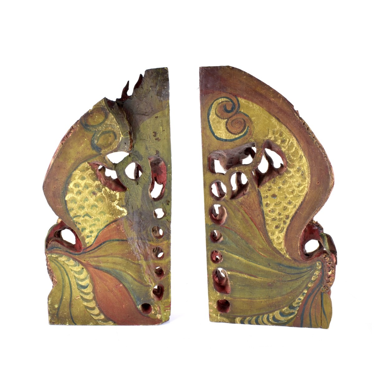 Pair of Antique Japanese Polychrome Deep Relief Temple Carvings. Each depicting a dragon in flight with ornate detailing. Measures 12" H x 24-1/2" W. Condition: Typical rubbing and wear associated with age Estimate: $200.00 - $500.00 Domestic Shipping: Third party