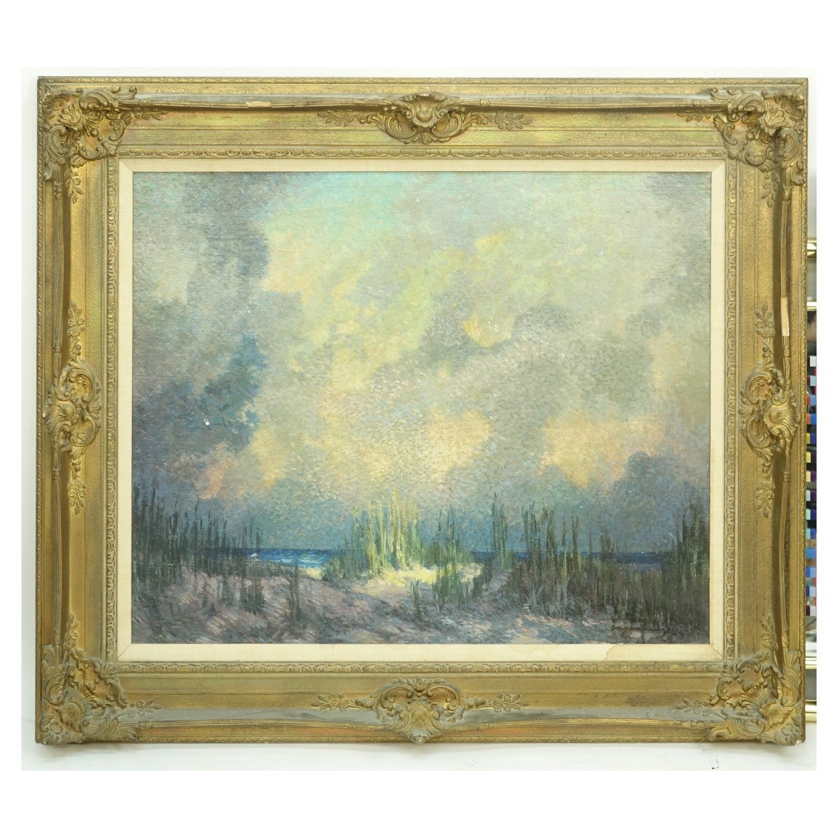 Mid 20th Century Pointillism School Oil on Canvas, "Beach at Cape Canaveral". Signed illegibly lower right. Measures 28" H, 34" W; frame measures 38-3/4" H, 44-1/2" W. Paper tag to frame reads "Made in Belgium", stretcher inscribed with title. Condition: Several dings to canvas with resulting minor paint losses. Overall good condition. Estimate: $150.00 - $300.00 Domestic Shipping: Third Party