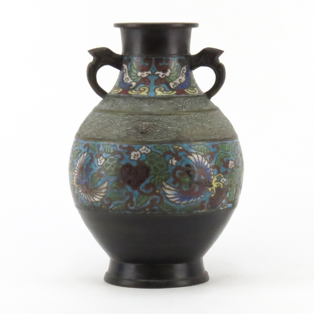 Antique Japanese Champlevé Enamel Bronze Vase. Decorative handles with intricate pattern work on surface. Measures 11-3/4" H. Condition: Rubbing and wear to enamel, dings, filled drill hole on underside. Estimate: $50.00 - $150.00 Domestic Shipping: $66.00