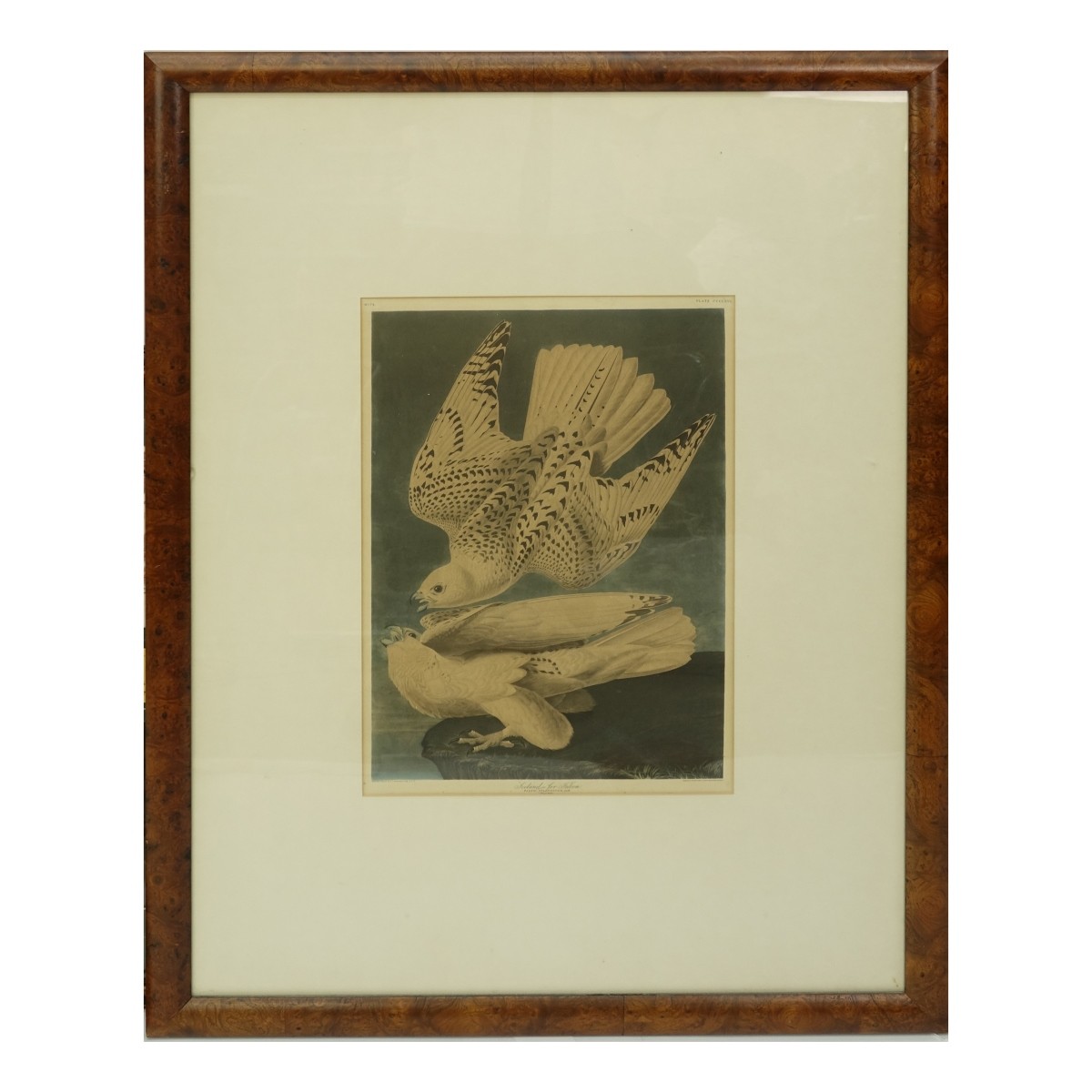 Falcons Engraved Framed Print J. J. Audubon. signed Iceland or Jer Falcon, Female Birds, Falco Ilandicus. Drawn from Nature J. J. Audubon. FF.R.S.S. F.L.S. Engraved Printed & Colored by R. Havell 1837. No. 74 Plate CCCLXVI. Professionally matted and framed. Measures 36-1/2" H x 26-1/4" W. Sight 18-1/2" H x 12" W. Condition: Good Condition, Toning, Faded . Estimate: $50.00 - $100.00 Domestic Shipping: Third Party